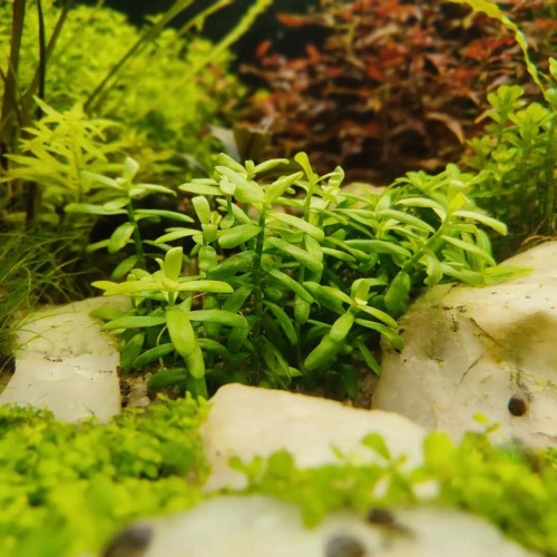 Крута рослина, яка не дивлячись на свої високі декоративні якості досить невибаглива. Рослина має соковитий світло-зелений колір, росте заввишки до 20 сантиметрів. Однак, враховуючи невелику швидкість її росту, нам подобається ця рослина на передньому і середньому планах, тому ми рекомендуємо їх обрізати і тримати заввишки 3-8 сантиметрів. В такому розмірі світло доходить до низу Хедіотіс Зальцмана, завдяки чому утворюються густі кущики, рослина не витягується до верху і частина пагонів розростається вздовж дна.